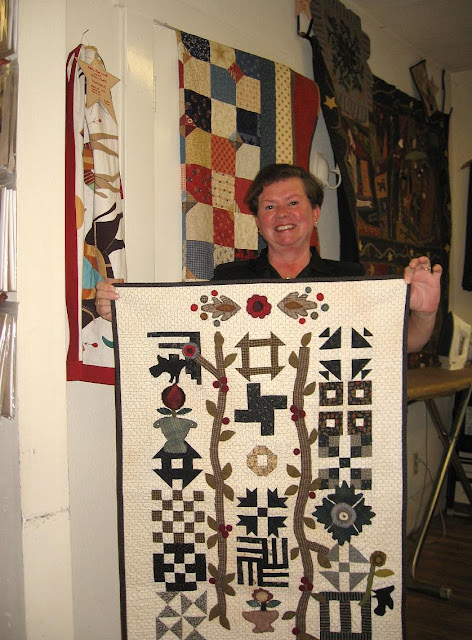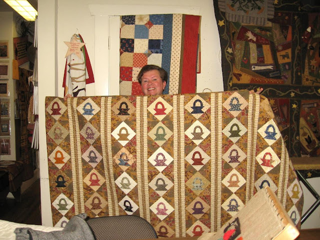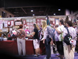 Imagine your at a large convention center lots of ladies walking around your feet is hurting from all the walking your doing.It seemed like the aisles were packed at times and then less ladies. This was not as busy a quilt show as three years ago when I went. That time they had actually ran out of food. That time it had been so packed that you could barely get in a booth this time there was only a couple booths like that. Primitive gathering quilt shop was a hit. That booth was packed the whole day.I loved looking at their wools and books.I went with Linda and Janet and we really didn't shop alot. I was disappointed I wanted to see some civil war material but there was none of that anywhere at the show. Heart to Hand had their usual nice wool patterns. That was good booth.