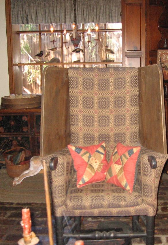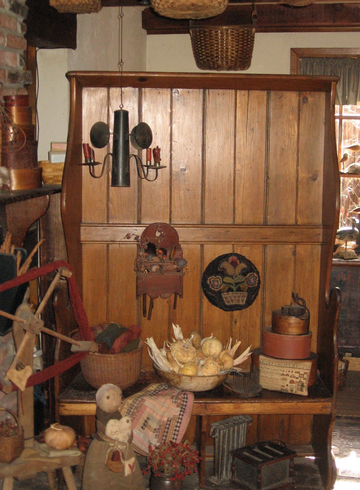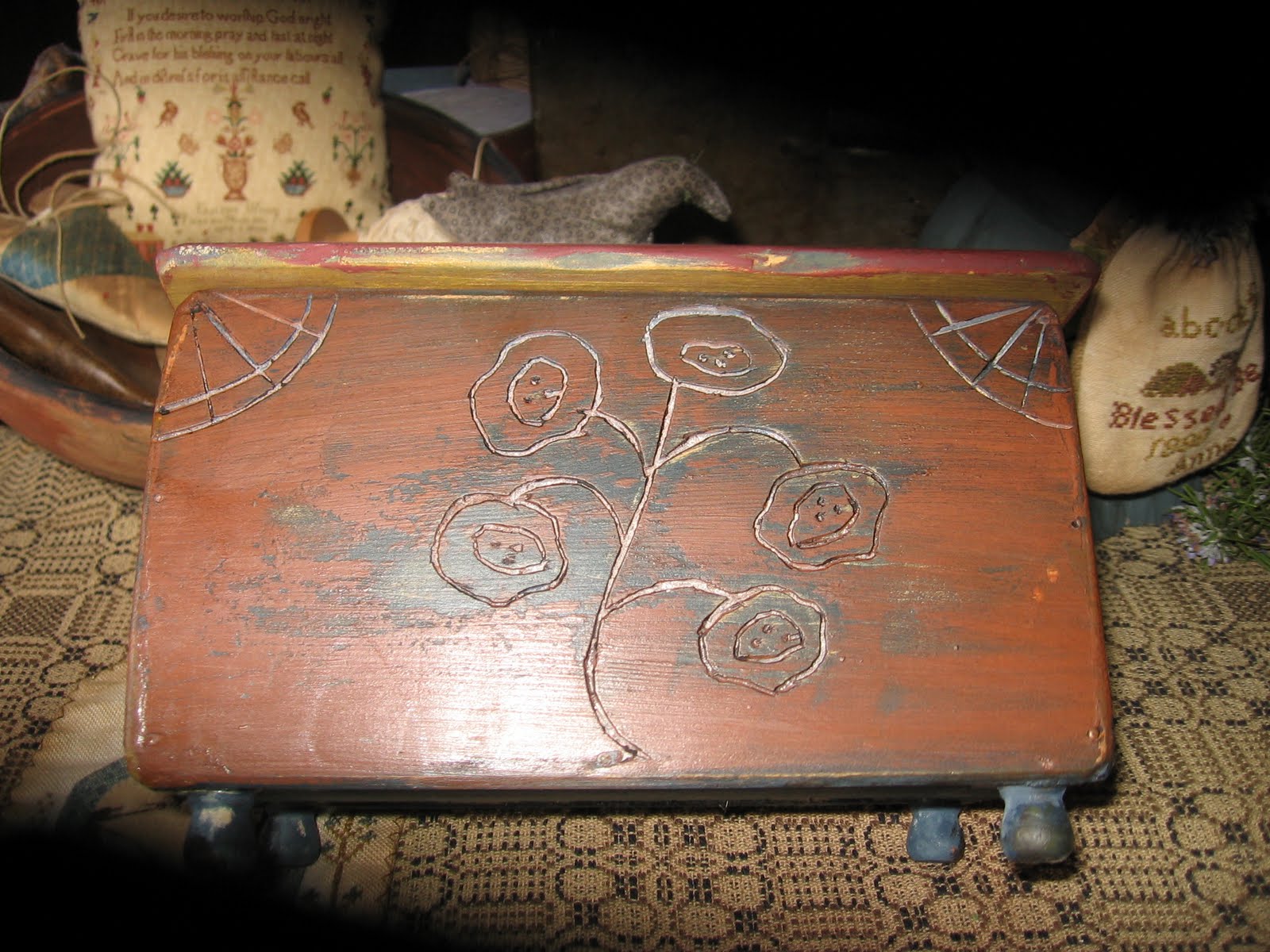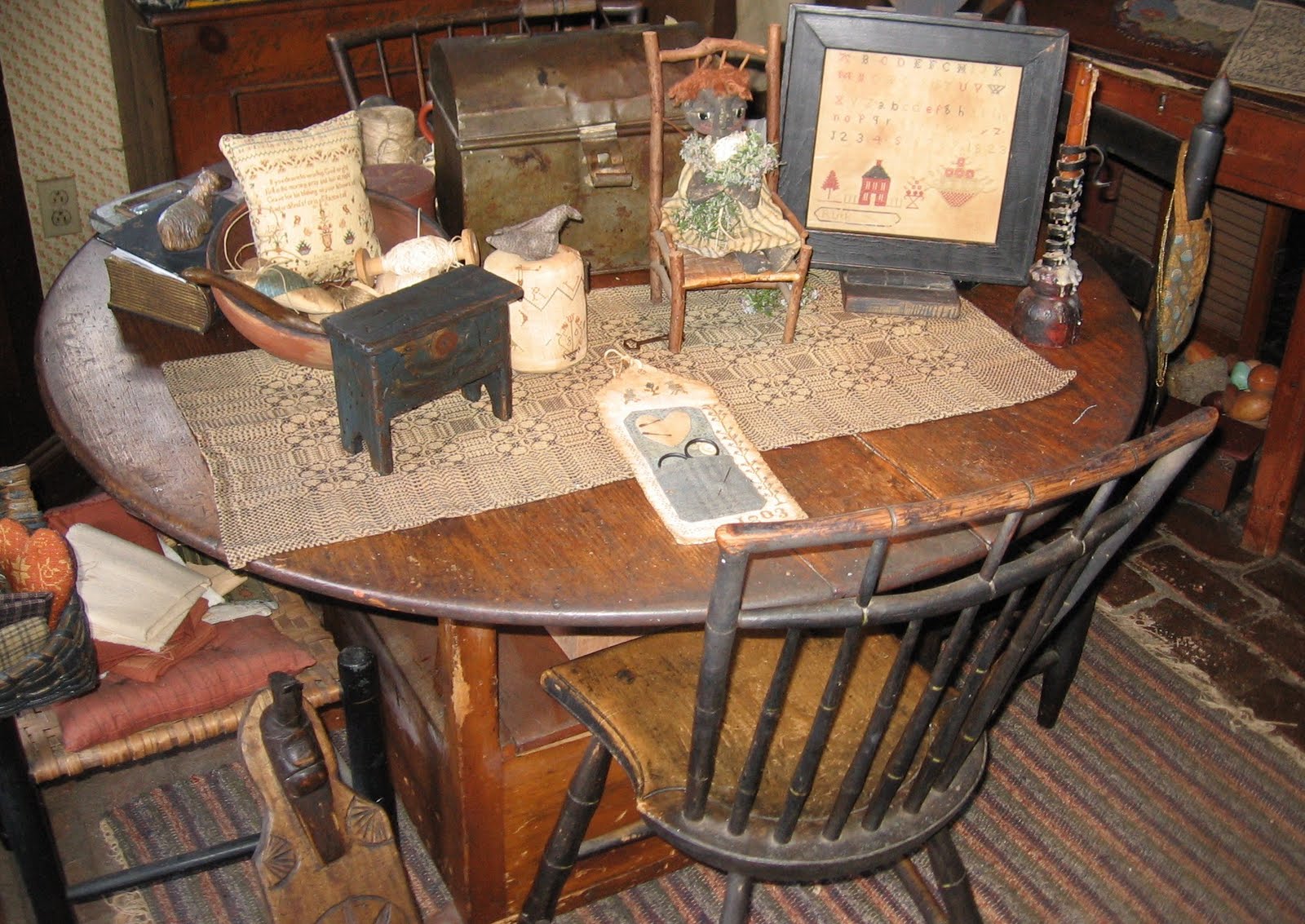 There was so much to see at Dee’s that I had to do a part two blog post. After we had sat enjoying her garden we went inside to share what we have been doing. I showed her my never ending wool crazy quilt and my chicken of course and Dee showed me some wonderful cheater fabric pillows she made. Dee had made a simple runner on a piece of plain canvas that was simple yet different.Her home is candy for your eyes your constantly looking at all the things she has made . Many of the things she has done in the past is little stitcheries and cross stitch.. When I saw this bowl full of little stitches made by her and gifts from her friends I had to take a picture.
